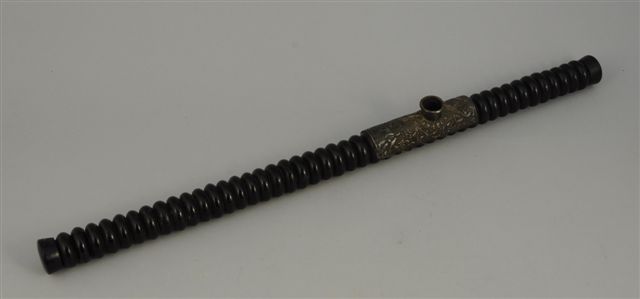 PIPE à opium, annelée, garniture argentée (argent ?). Long. 58 cm.