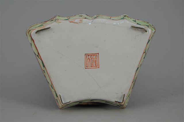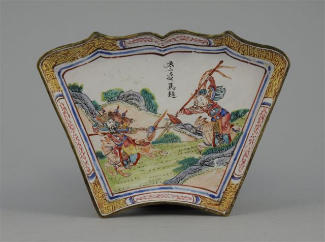 COUPELLE en cuivre émaillé, de forme quadrangulaire, à décor de deux cavaliers combattant. Chine, Canton (?). Haut. 2, Long. 15,5, Larg. 11 cm (fêles et accidents)
