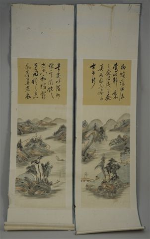 Deux paysages, formant pendants. Encre et aquarelle. Montés sur papier, avec texte. Japon. Dim. totale : 127 x 34,5 cm (travaux de vers)