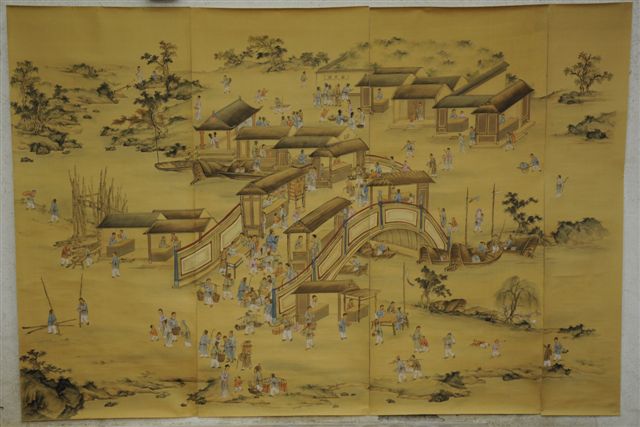 Paysage au pont animé de personnages. Encre et gouache sur tissu maroufflé sur papier. Chine, XXème.