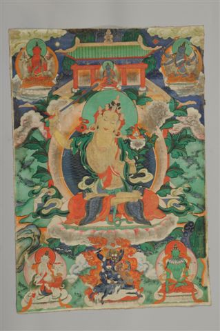TANKA. Toile peinte représentant Manjusri assis. Tibet. 62 x 43,5 cm.