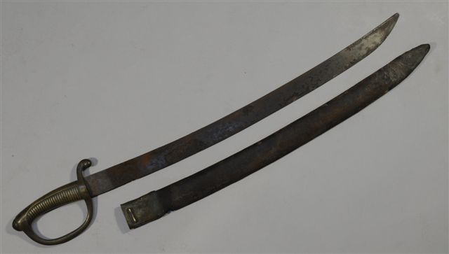 SABRE infanterie, modèle de l'an 13. Dos de la lame gravé "J C Chaillot 1831" (?). Fourreau en cuir (perforation, manque la bouterolle, chocs, en l'état). Long. de la lame : 58,5 cm. Long. totale : 72 cm. (lame oxydée)
