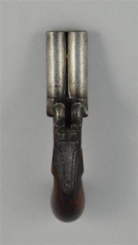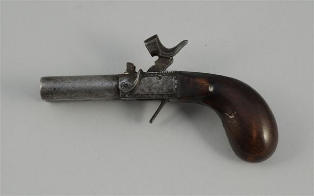 PISTOLET à percussion de gousset, à coffre en partie gravé, 2 canons juxtaposés, double détente escamotable, crosse en en noyer. Louis-Philippe. Long. totale : 14 cm.