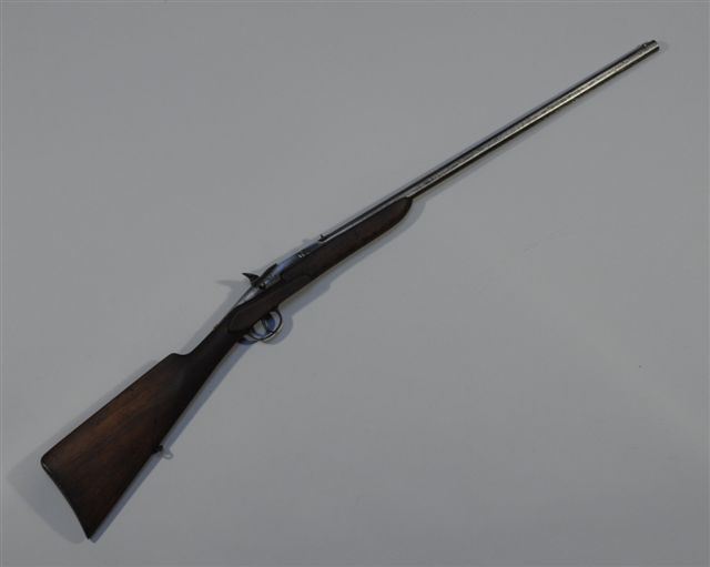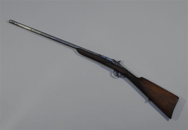 CARABINE 1 coup, type Flobert, canon octogonal, 9 mm, crosse noyer (?). Long. totale : 101,5 cm.