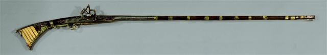 Long FUSIL à silex Moukalah Marocain. Canon rond, légèrement tromblonné à la bouche, à pans au tonnerre, maintenu par 15 bagues, 12 en laiton et 3 en fer gravé. Platine à la chenapan. Pontet en laiton ciselé. Crosse en bois teinté à décor incrusté de fils et de plaques d'os gravé, polychrome, garni de laiton découpé. Talon de crosse en os de chameau gravé, renforcé aux extrémités de plaques de fer découpées. Baguette en fer.
