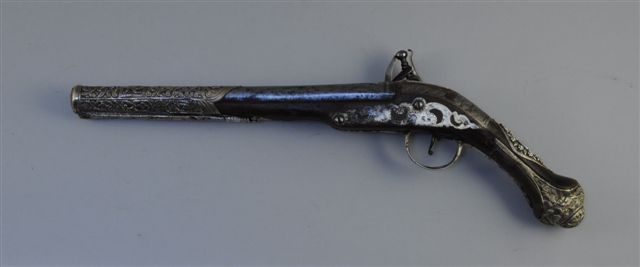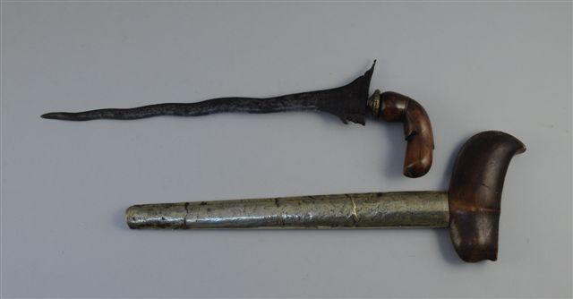 POIGNARD Chriss Malais. Poignée courbe en bois brun, sculptée en tête d'animal. Virole en laiton gravé. Lame flamboyante en acier. Fourreau en bois recouvert sur la partie droite d'une plaque en laiton gravée sur une face à motif de rinceaux feuillagés.