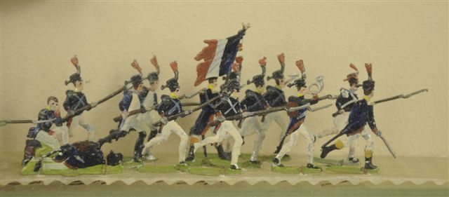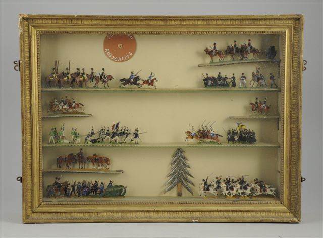 Ensemble de PLATS d'ETAIN polychromes. La bataille d'Auzterlitz. 94 unités : militaires ou groupes de militaires, attelages. Présentés sur trois niveaux reconstituant la bataille du 2 décembre 1805, dans un cadre d'époque Restauration aménagé en vitrine.
