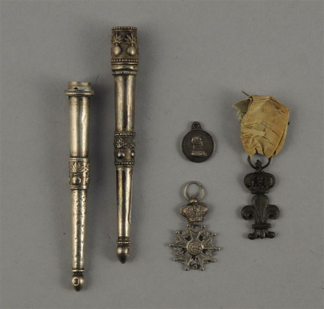 LOT comprenant : MÉDAILLE en argent au profil de 'Louis-Philippe Premier Roi des Français", mention au revers "La Chartre sera désormais une vérité". Restauration. Diam. 14 mm. Deux réductions de DÉCORATIONS en argent : l'une représentant une fleur de lys surmontée d'une couronne fermée, l'autre de l'Ordre du Saint-Esprit.