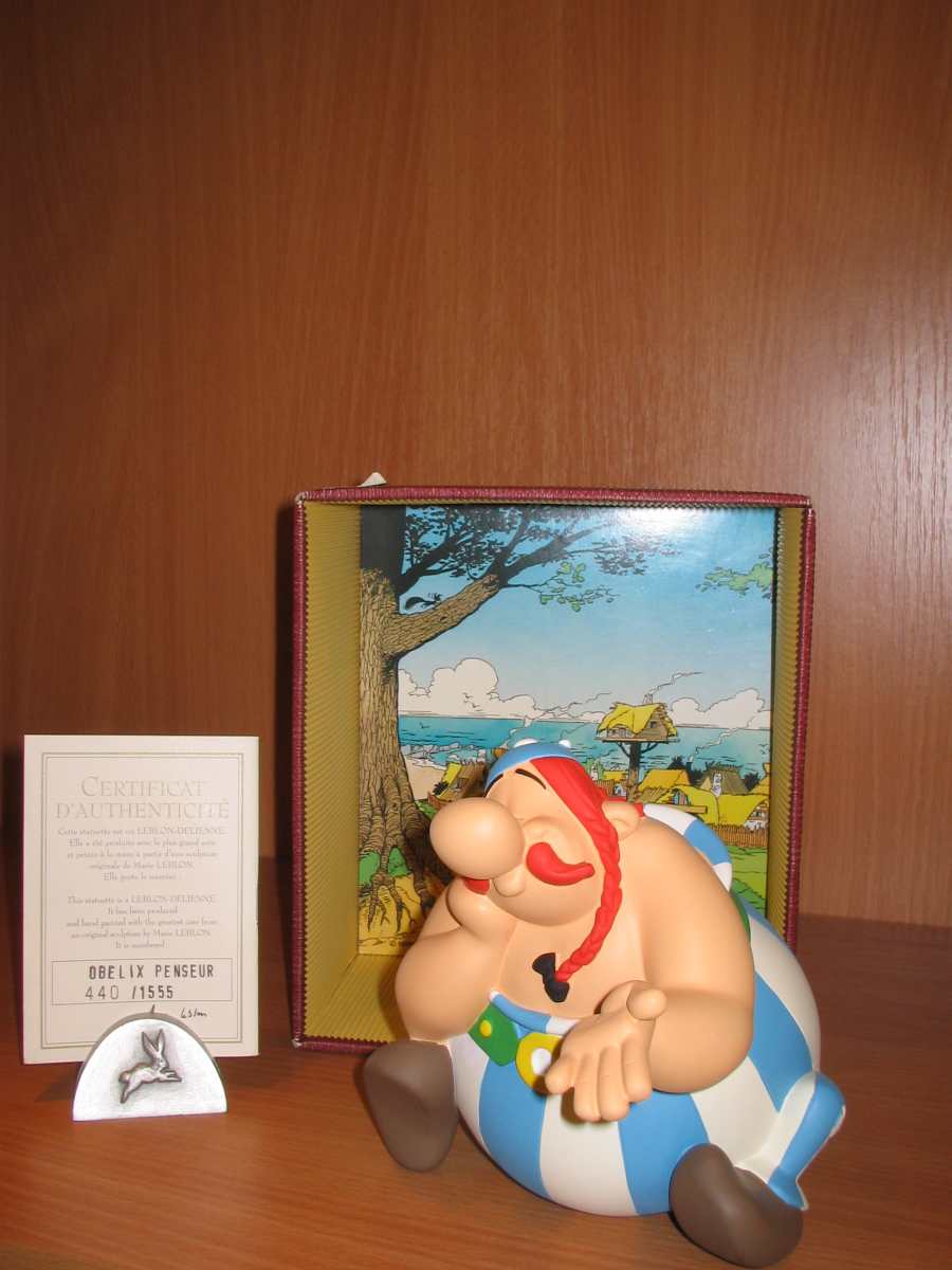 "Asterix"OBÉLIX PENSEUR.Résine. Figurine Leblon-Delienne. Certificat n°440 / 1555.Dans sa boîte...