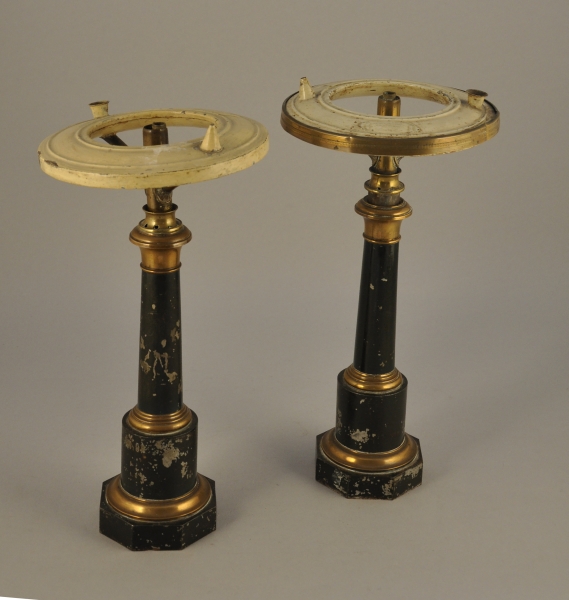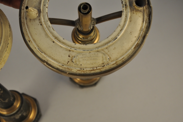 PAIRE de LAMPES à HUILE. Couronne en laiton et tôle peinte vert et crème. Inscription sur une plaque "Par brevet d'importation, concession M. et Cie". Marque aux cornes d'abondance.