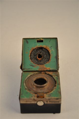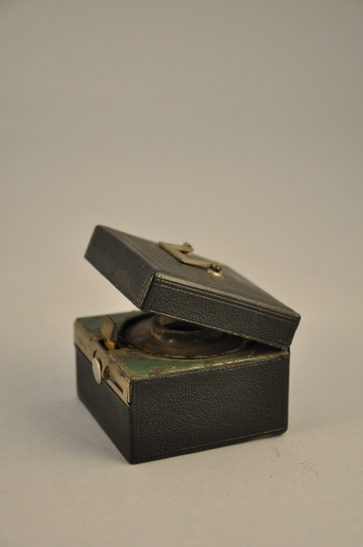 ENCRIER de VOYAGE "vanity case" pour la maréchaussée, de forme cubique en métal gainé de carton bouilli noir. Sous le couvercle à fermeture par ergot l'intérieur recèle le flacon encrier cylindrique en verre obturé.