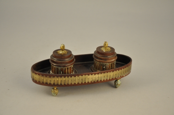 ÉCRITOIRE ovale en bois et laiton reposant sur quatre pieds pomme-de-pin, composé de deux compartiments couverts surmontés d'une fleur de pavot pouvant contenir godet ou poudroir.