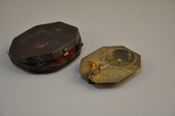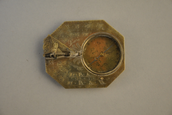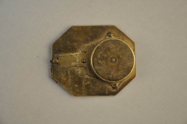 BOUSSOLE-CADRAN SOLAIRE en laiton gravé. Gnomon pliable à décor d'oiseaux. La table gravée aux heures en chiffres romains. Porte l'inscription "MEURAND. APARIS". Au dos, gravure des déclinaisons magnétiques pour les villes de France. Boussole protégée par en verre.