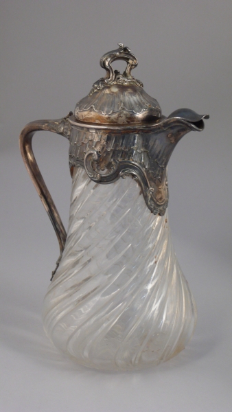 AIGUIÈRE en cristal à côtes torses à monture en argent. Motifs de vagues stylisées et volutes feuillagées. Le bec verseur de forme "canard". Couvercle à pas de vis, à prise rocaille. Poinçon Minerve.