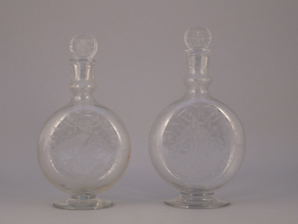 BACCARAT. Deux CARAFES sur pied en cristal en forme de gourde aplatie, modèle "Michel-Ange", gravée à l'acide. L'une marquée.