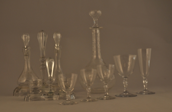 SERVICE de 82 VERRES en CRISTAL, de forme évasée sur pied ballustre hexagonal enfermant une goutte d'eau, au chiffre "CS" gravé à la pointe de diamant, comprenant :
