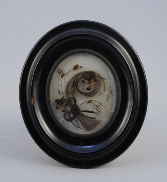 Cheveux blonds et bruns collés sur verre fomant une volute et un branchage fleuri stylisé lié par un ruban en noeud de rosette. Fond de papier blanc. Cadre en bois noirci et baguette de métal, verre bombé.