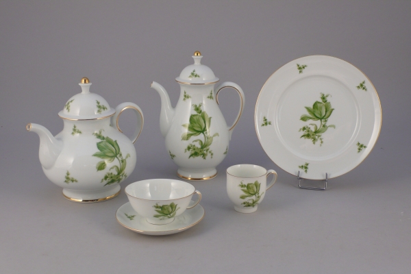 SERVICE à THÉ et CAFÉ 16 pièces en porcelaine à décor floral imprimé en vert comprenant : une théière, une cafetière, 4 tasses à thé et 5 sous-tasses, 4 tasses à café et 6 sous-tasses, 6 assiettes à dessert (égrenure).