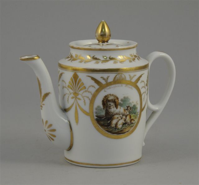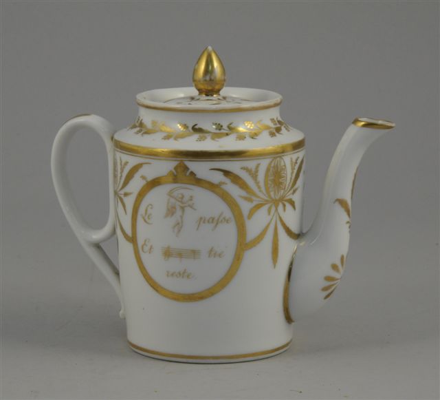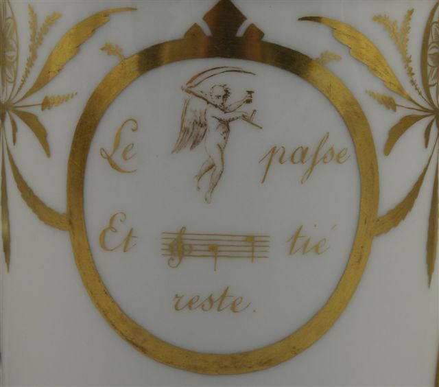 PARIS. VERSEUSE en porcelaine. Le corps cylindrique à décor or tournant de guirlandes agrémentée de motifs en rosace et palmette, orné, dans deux réserves ovales, sur une face, d'un rébus "Le [temps] passe et [l'ami] tié reste", et sur l'autre face, d'un décor polychrome représentant une chienne et ses petits "L'intérefsante Finette".