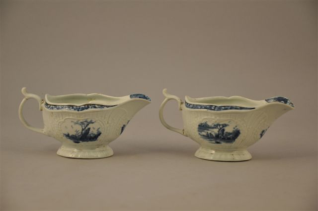 ANGLETERRE. PAIRE DE SAUCIÈRES en porcelaine tendre à décor blanc et bleu de scènes champêtres dans des cartouches. L'une des anses marquée "R".