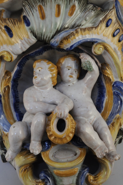 CONSOLE d' APPLIQUE en faïence à décor peint jaune, vert et bleu en haut-relief de putti dans une coquille entourée de feuilles d'acanthes stylisées.