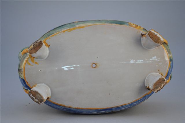 JARDINIERE de table en faïence polychrome à décor de scènes mythologiques, reposant sur des pieds en volutes.