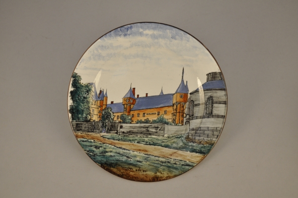 GIEN. ASSIETTE À LA PRISON DE GIEN en faïence, à décor en plein du palais de justice et de la prison de Gien. Assiette attribuable à Aimable MAROIS, à titre d'essai pour ce décor.