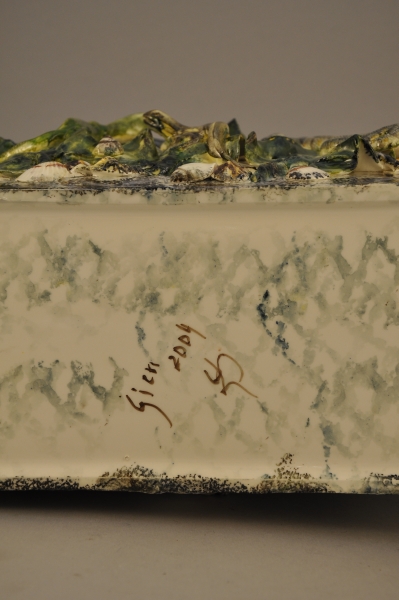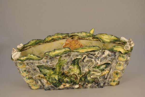 GIEN. JARDINIÉRE ÉVENTAIL en faïence, à décor relief dans le goût d'AVISSEAU à l'intérieur de Saint-Jacques et à l'extérieur de lézards, serpents, coquillages, tortues et autres créatures aquatiques. Travail contemporain de Christine VIENNET.