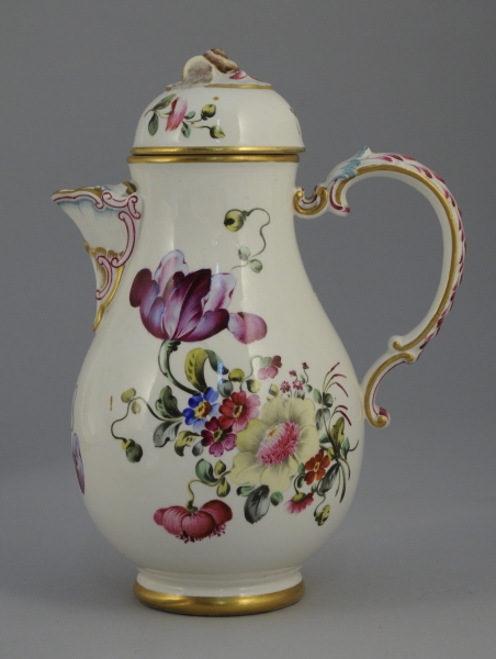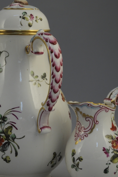 GIEN. SERVICE à CAFÉ en faïence fine comprenant une cafetière, un sucrier, un pot à lait, trois tasses, quatre sous tasses et un plateau, à riche décor polychrome de fleurs. Les anses feuillagées en double volute accolées. Filets or. Les tasses de forme calabre, le sucrier à côtes pincées, cafetière et pot à lait piriformes. Le plateau à anses mouvementées. Coquillage en relief agrémentant les anses du plateau et la prise du couvercle de la cafetière. Prise du couvercle du sucrier en volute rocaille. Marque manuscrite sous la base. Dans le goût des productions de Niderviller du XVIIIème.