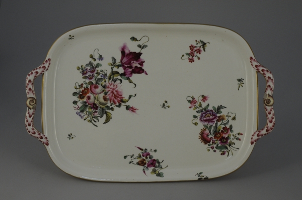 Plateau : 30 x 46 cm. Cafetière : Haut. 20 cm (égrenure au bec verseur de la cafetière, tasses et anses du pot à lait accidentées et restaurées, fêle à une sous-tasse).