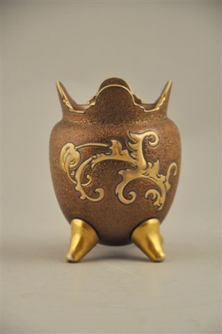 GIEN. VASE DÉCOUPÉ AU CHEVALIER DE TOLÈDE en faïence, à décor "d'émaux chagrins", reposant sur quatre pieds crosses dorés. Un chevalier en armure en application d'or mat se découpe sur un fond d'émail granuleux marron sombre métallisé. Intérieur du vase de couleur ivoire.