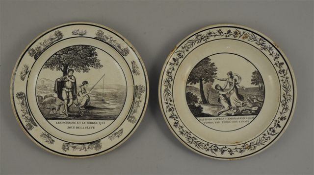 MONTEREAU. DEUX ASSIETTES en faïence fine à décor imprimé en noir. "Les poissons et le berger qui joue de la flûte". Paysages sur l'aile, alternés de scènes animalières. "Daphis courant embrasser Chloé tomba par terre tout pâmé". L'aile à décor d'une frise de fleurs. Marques en creux.