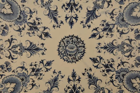 ROUEN. Beau et grand plat en faïence de grand feu à décor dit "lambrequins" rayonnant en camaïeu bleu, à motifs de ferronnerie.
