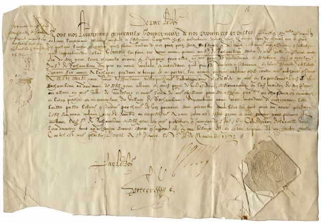 Passeport délivré à René II de Vimeur, Sr de Rochambeau, pour sortir de la ville de Paris assiégée par l'armée d'Henri de Navarre.