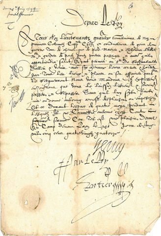 P.S., contresignée par le secrétaire d'État Pierre FORGET sieur du Fresne, au camp de Saint-Denis 17 juillet 1593 ; 1 page in-fol. Coin déchiré. Cachet sec aux armes de France.