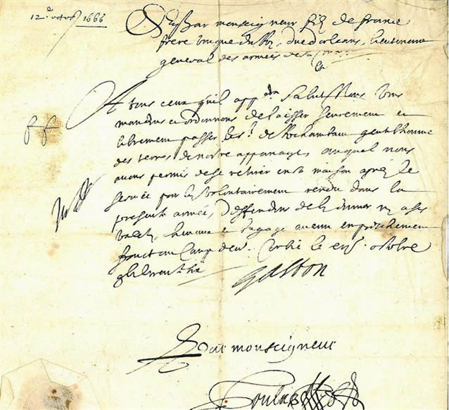 ) m'estant trouvé maintenant dans mon apanage, il a pleu au Roy Monseigneur m'envoye une commission par laquelle Sa Majesté m'ordonne de mander à toute la noblesse d'iceluy et de quelques aultres provinces circonvoisines qu'elle ayt à se monter armes et équipes au mieux qui luy sera possible pour aller dans la Picardie s'opposer aux ennemis de l'estat et empescher qu'ils n'y facent le progrez qu'ils prétendent faire (...) je ne laisse de vous prier [