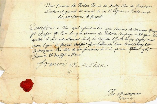 François de ROHAN, prince de SOUBISE, (1630-1712), lieutenant-général des armées du roi et capitaine-lieutenant des gendarmes de la garde. P.S., Saint Omer 1er mai 1677 ; 1 page obl. in-fol., cachet cire rouge.
