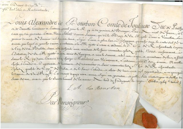 Louis Alexandre de BOURBON, comte de TOULOUSE (1678-1737) amiral de France. P.S., à bord du Foudroyant 20 octobre 1703, contresignée par Jean Baptiste du Trousset de VALINCOURT, secrétaire général de la Marine ; vélin obl. in-fol., fragment de cachet cire rouge.