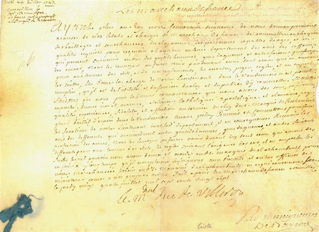 Commissions de lieutenant des Maréchaux de France dans le Vendômois délivrées à Joseph-Charles II de Vimeur, marquis de Rochambeau, père du maréchal.