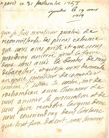 JOINT : Marie Claire Thérèse BÉGON (? - 1782), épouse de Joseph-Charles II de Vimeur, marquis de Rochambeau, et mère du maréchal. L.A.S., Paris 31 décembre 1758 ; 2 pages in-4.