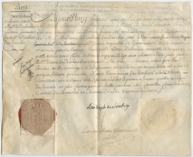 Brevet de 3 000 livres de pension délivrée à Marie Claire Thérèse Bégon, épouse de Joseph Charles II de Vimeur, marquis de Rochambeau, mère du maréchal, gouvernante de la famille d'Orléans. [La marquise de Rochambeau exerça ses fonctions de gouvernante des enfants de la Maison d'Orléans à partir de 1745 jusqu'en 1777, époque à laquelle Mme de Genlis lui succéda dans cette charge.]