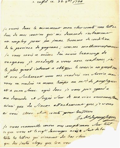 Louis Pierre de CHASTENET, comte de PUYSÉGUR (1727-1807). L.A.S., Cassel 22 octobre 1760 ; 1 page 1/4 in-4 (manque).