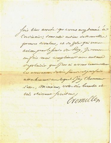 Je viens Monsieur d'apprendre par un courrier de M. le Maal et par la lettre que vous avez écrit à M. le Cte de Stainville la victoire que vous avez remportée sur M. le Pce héréditaire. Le succès de cette importante journée est du en grande partie aux prodiges de valeur que le régiment d'Auvergne y a fait et à la façon dont vous l'avez conduit, recevez en je vous supplie mon compliment (...)