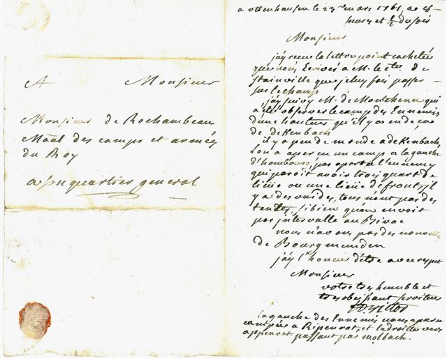 JOINT : 2 lettres d'officiers : - M. de MONTCHÉNU, Londorff 23 mars 1761 ; 1 page ½ in-4, adresse et cachet cire rouge aux armes (brisé). - Baron de SAINT VICTOR, Ottenhausen 23 mars 1761 ; 1 page in-8, adresse. Comptes-rendus du mouvement des troupes ennemies adressés au comte de Rochambeau, maréchal de camp.
