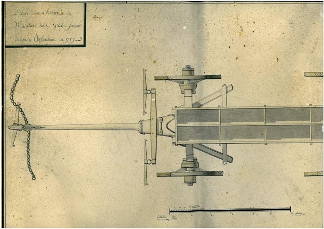 Plan d'un chariot de munitions tels qu'ils furent armés à l'infanterie en 1757. Dessin à la plume et aquarelle. 53 x 34 cm. Signé en bas à droite : « D.M.J. Rochambeau fecit ». Dans l'état.