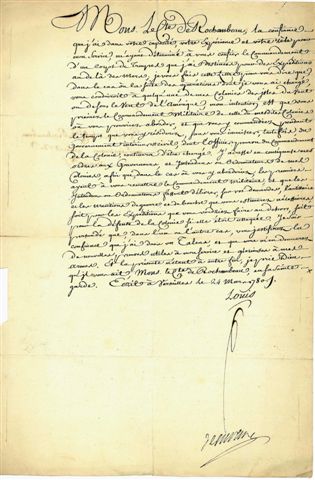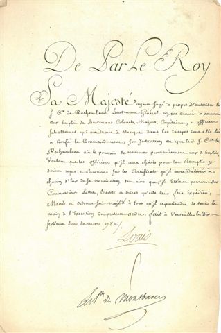 2 ordonnances royales reconnaissant le commandement du corps expéditionnaire au comte de Rochambeau, et lettre de Louis XVI adressée au comte de Rochambeau, lui étendant son commandement militaire du corps expéditionnaire dans les colonies des Îles du Vent ou sous le Vent.