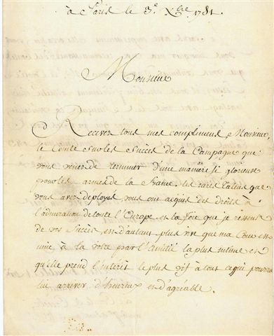 Lettre adressée au comte de Rochambeau pour le féliciter du succès militaire de Yorktown.