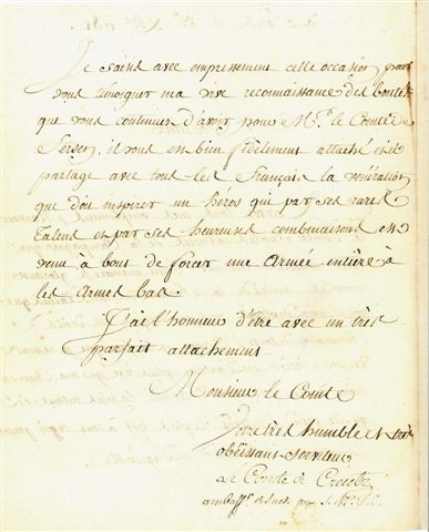 Recevez tout mes compliments, Monsieur le Comte, sur les succès de la campagne que vous venez de terminer d'une manière si glorieuse pour les armes de la France. Les rares talents que vous avez déployés, vous ont acquis des droits à l'admiration de toute l'Europe. Et la joie que je ressens de vos succès, est d'autant plus vive que ma cour est unie à la vôtre par l'amitié la plus intime et qu'elle prend l'intérêt le plus vif à tout ce qui pourra lui arriver d'heureux et d'agréable.
