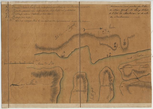 Ouvrages et redoutes - Morisania, une partie de l'île de New-York, de Long-Island, de l'île de Montrésor et de celle de Buchanan. Calque en 3 sections montées sur toile et pliées, formant une carte de 33,5 x 24 cm. Plan manuscrit figurant les redoutes, blockhouses et batteries.