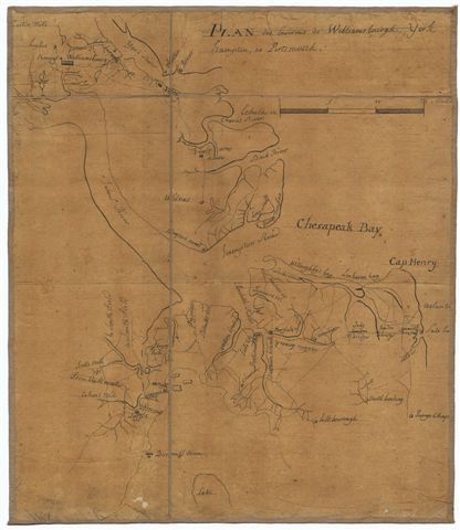 Plan des environs de Williamsbourgh, York, Hampton et Portsmouth. Calque en 4 sections montées sur toile et pliées, formant une carte de 25 x 29 cm. Plan manuscrit figurant la baie de Chesapeake.